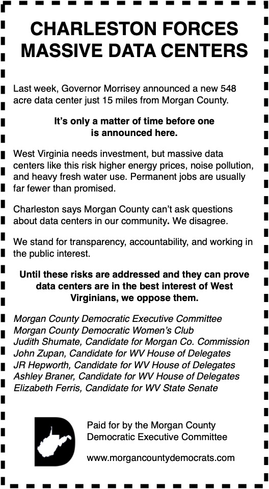 Welcome to the Morgan County Democratic Party. We stand for economic fairness, equality of opportunity and progressive leadership that fights for quality education for our children, wages that can sustain a family, a clean environment and affordable health care.